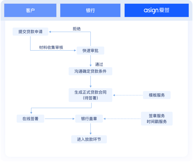 客户线上提交贷款申请,系统审批生成电子合同,爱签助力完成身份认证与签署确认,实现贷款业务全流程数字化办理。
