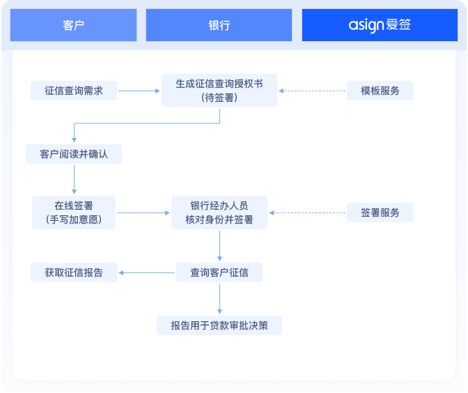 客户在办理信贷业务时,通过爱签平台在线签署征信查询授权书,系统实时完成身份验证与电子签名,授权银行依法查询征信报告,确保业务合规。