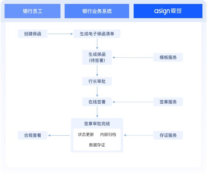 企业客户通过企业网银提交保函申请,系统生成保函协议及开立申请书。通过爱签平台完成企业授权代表认证及协议签署,实现保函业务线上化办理。