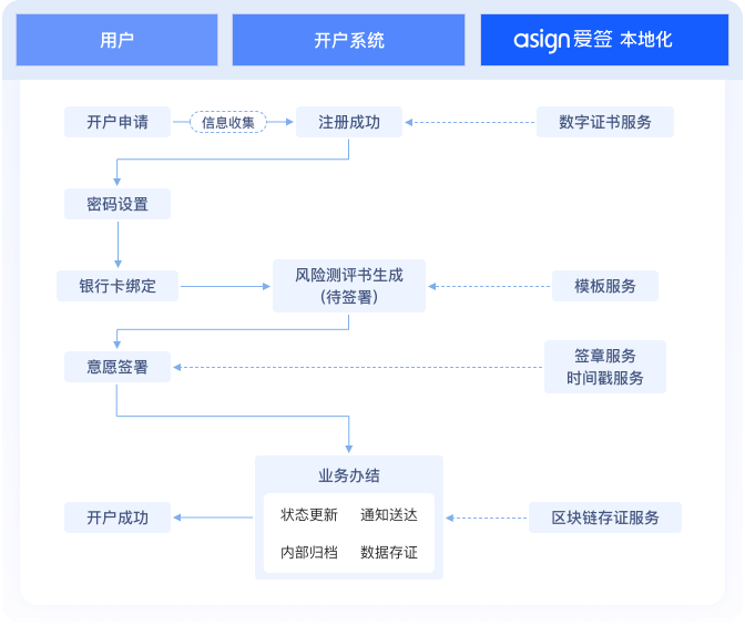 投资者通过证券 APP / 官网提交开户申请,系统验证身份并生成电子协议。借助爱签平台,在线完成风险测评与协议签署,实现远程自动化开户。